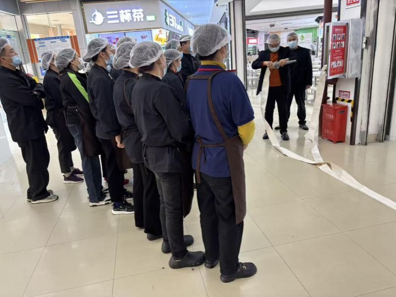 演练现场,各项实操科目有序开展。消防水带实操环节,员工两人一组配合默契:一人快速打开消防箱门、按下启泵按钮,完成水带与栓口连接;另一人铺设水带确保平直无扭折,连接水枪奔至模拟着火点附近,两人协同握紧水枪完成模拟喷水。现场指导人员全程强调操作要点,规范水带接口拧紧、握枪姿势等关键环节,确保员工熟练掌握技能。
